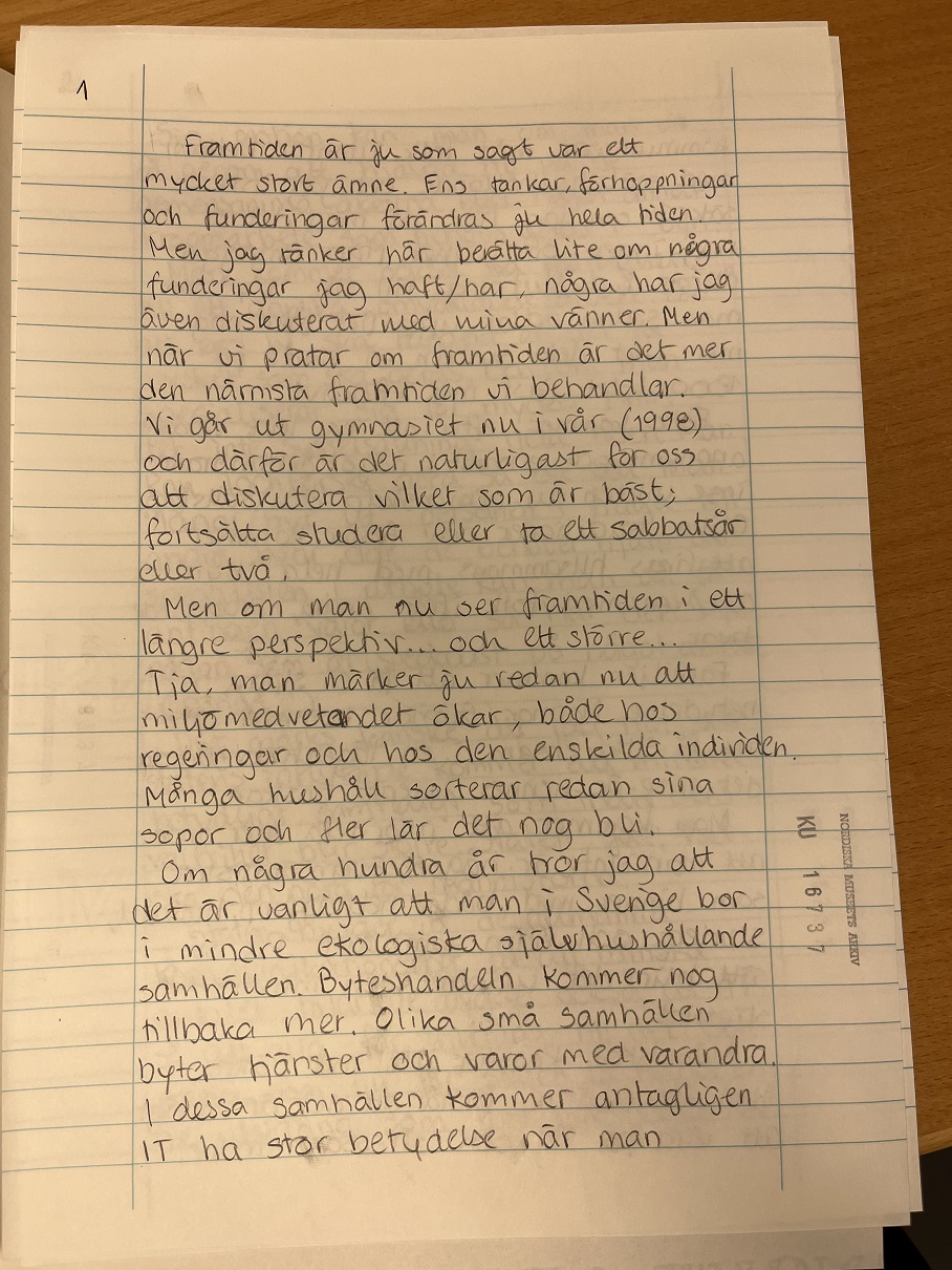 Om några hundra år tror jag att det är vanligt att man i Sverige bor i mindre ekologiska självhushållande samhällen. Byteshandeln kommer nog tillbaka mer. Olika små samhällen byter tjänster och varor med varandra. I dessa samhällen kommer antagligen IT ha stor betydelse när man kommunicerar med folk utanför. Detta med självhushållande vet jag inte säkert om jag tror på men det är nog ingen omöjlighet. Man anlägger åkrar i anslutning till sin ”by” som man sedan odlar upp. Det blir nog mer likt det system vi hade på 1800-talet fast mer effektivt. Folk kommer, efter att ha levt väldigt anonymt och ensamt i något århundrade, inse vikten av gemenskap och sällskap. Olika traditioner och fester kommer att firas tillsammans med hela ”byn” och även med folk från andra, närliggande byar. Familjen kommer att få en större betydelse. Mormor/farmor kommer inte att få sitta ensam i en lägenhet såvida det inte är hennes innersta önskan. Man kommer att prioritera mer, inse att man inte är någon övermänniska som hinner med både heltidsjobb, hushåll, studera och barn samtidigt. På så sätt blir det lugnare och mindre stressigt. Människor kommer att må bättre. Man äter bättre, förstår att det är viktigt att röra på sig och stressar mindre. Sin motion kan man, om man vill, få genom att hjälpa till på de gemensamma åkrarna eller något annat kroppsarbete som behövs göras i ”byn”. Man kommer också ha möjlighet till ett ganska omväxlande arbete. För att ens by ska fungera är det ju mycket som ska göras. Och om man specialiserar sig för mycket finns det inte sysselsättning hela tiden. Man kan i och för sig göra så då att man ”lånar/hyr ut” personen i fråga till andra byar där de behöver hjälp av specialisten. I utbyte kan man då få antingen varor eller så har den byn någon som är specialist på något annat (rörigt?!). Det märks kanske att jag tror att statens inflytande kommer att minska betydligt samtidigt som individens valfrihet blir större. Staten, ja?! Vad ska den göra för människorna? Staten bygger ut de allmänna kommunikationerna för att minska antalet bilar. De bygger också ut IT, så att alla får tillgång till det. Och precis som nu får staten ta hand om de utslagna som inte ”byn” klarar av. Det bör kanske nämnas att det ligger på byns ansvar att se till att alla innevånare har mat och husrum. Det är bara i nödfall som staten ska behöva ingripa. Ok, det här var framtiden ur ett ganska lokalt perspektiv. Det är svårare att tänka sig hur världen kommer att se ut, och hur man skulle vilja att världen såg ut om några hundra år. Men jag gör ett försök … Det kommer antagligen inte vara fullkomlig fred på jorden men jag är övertygad om att det inte är långt ifrån. Folk kommer att ha bättre förståelse för varann och inse att alla är lika värda. De flesta har i alla fall kommit så långt, men kanske inte alla. Jag tror att det fortfarande kommer att vara stor skillnad i utvecklingen i olika länder. Det kommer att gå framåt men skillnaden kommer fortfarande att vara enorm. Jag tror att de s k I-länderna hjälper U-länderna med kunskaper och teknik i större utsträckning än nu. Och mindre ”rena pengar”. EU kommer att vara större och bättre organiserat än dagens läge. EU:s främsta uppgift kommer absolut vara att säkra freden i Europa. Givetvis kommer vi att hitta botemedel mot HIV även om det nog dröjer ett tag innan vi får bukt med det. Men då kommer det att dyka upp nya värre sjukdomar eftersom jorden annars skulle bli alldeles för överbefolkad. Denna beskrivning av framtiden är mer en önskedröm än en verklighetsanknuten teori. Men visst finns det en liten chans ett det blir så här. Jag har fler teorier om framtiden men denna är nog den mest genomtänkta. Jag har en teori där jag ser mänskligheten rusa på i samma tempo som nu ända till allting bara rasar samman det det blir fullkomligt kaos. Men den är så deprimerande att jag inte tänker på den särskilt ofta. Och förresten så har jag högre tankar om oss människor än att jag tror att vi kommer låta något sådant hända. Jag har nog över huvud taget en ganska optimistisk inställning till framtiden och vad den för med sig.